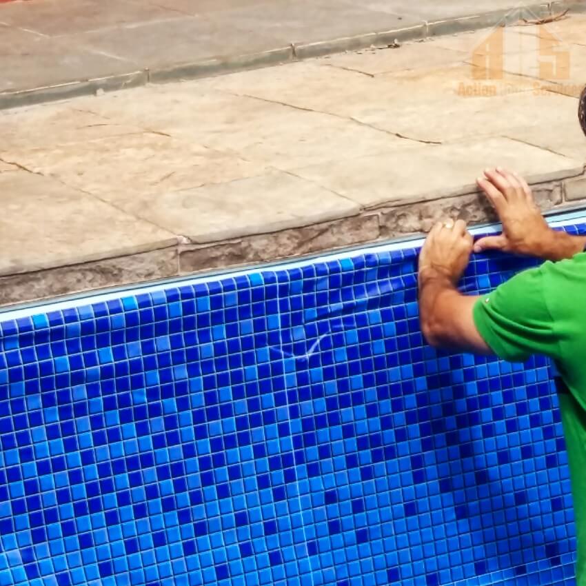 The vinyl liner is laid down to beautify the pool and create the desired finish, followed by filling the pool with water.